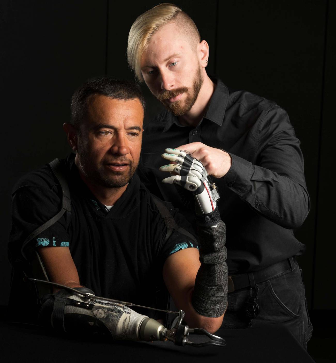 Marshall Trout (derecha) probó con cuatro personas amputadas un sistema de IA capaz de controlar una prótesis avanzada de forma conjunta con el usuario, mejorando la destreza y haciendo su manejo más intuitivo. / Laboratorio de NeuroRobótica de Utah